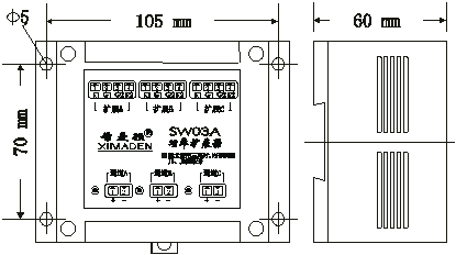 SW03A設計上采用 金曼頓小型功率擴展固態(tài)繼電器,驅動三路單相或三相大功率反并聯晶閘管或雙向晶閘管。輸入電平和日 本島電占空比(P型,SSR)調節(jié)輸出類型儀表兼容,例如:SR90、SR1/3/4等系列。其安裝方式為DIN標準導軌或四孔螺絲。輸入使用UL標準的電力接線端子,輸出使用可拔插端子,方便用戶使用。220V AC和380V AC下均可工作,配套S302Z擴展固態(tài)繼電器(無阻容吸收回路)。參照電路原理圖,在前級固態(tài)繼電器導通時,強制后級大功率晶閘管導通,對后級晶閘管無特殊要求。以通道一為例,電路中元件的具體作用如下:I1是前級固態(tài)繼電器的限流電感;R1、R2為陰極電阻,用于提高靜態(tài)dv/dt;C1、R3為阻容吸收回路;L1為輸入指示發(fā)光二極管;每路固態(tài)繼電器要求輸入不小于4V,驅動電流不小于15mA(最大不超過30mA)。出廠為J1,J2短路的三相工作方式,此時僅保留L1發(fā)光二極管作為輸入指示。J1、J2開路為三個獨立的單相。端子D1- D3可參照電路原理圖接線。此外,當驅動兩支單向晶閘管時,可安裝兩只反向保護二極管D1- D8(1N4007)。內部的阻容吸收元件為180Ω和0.1μF,也可根據實際負載情況外配阻容吸收器。